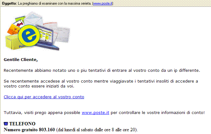 Buona sera, due righe per avvisare gli utenti che sono di nuovo in circolazione mail truffaldine inerenti le poste Italiane, se le ricevete, solita procedura, stampatela e se avete un conto bancoposta informatevi presso la sede in cui l'avete aperto se ci sono problemi di qualsiasi genere. La procedura è sempre la stessa, vi viene richiesto di cliccare su di un link fraudolento e di inserire i vostri dati riservati.